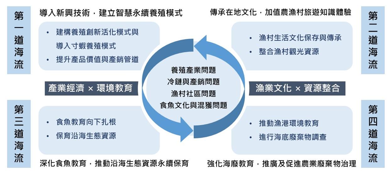 為解決上述宜蘭沿海鄉鎮養殖產業與漁村社區之場域問題, 本團隊以智慧無毒養殖技術導入與樂活觀光休閒漁村營造為兩大主軸。透過協助農漁業生產(一級) 、 輔導加工及冷鏈保存(二級) 、建置產地小旅行與直售所(三級),建立六級產業發展模式 ,活用地域資源與閒置空間,提高水產品自給率,並藉由食農食魚教育逐步影響消費者的環境永續認知素養,以達到減少環境的負荷,逐步建立「智慧樂活水產村」。